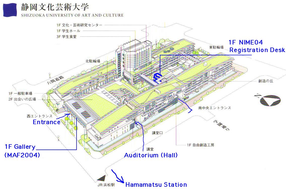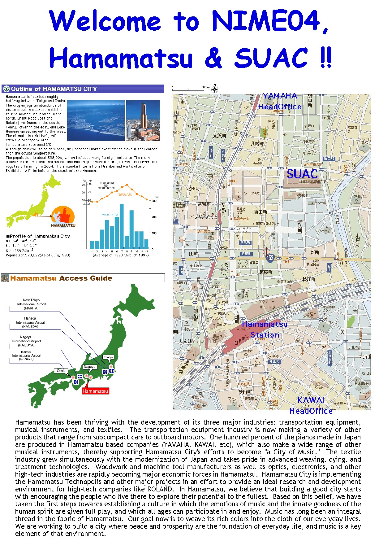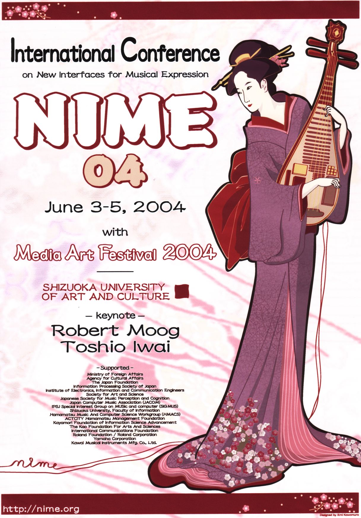 NIME04 kept up with NIME01, NIME02 and NIME03 spirit. The conference was hosted by Shizuoka University of Art and Culture (SUAC) in the "city of musical instruments" Hamamatsu, Shizuoka, Japan.