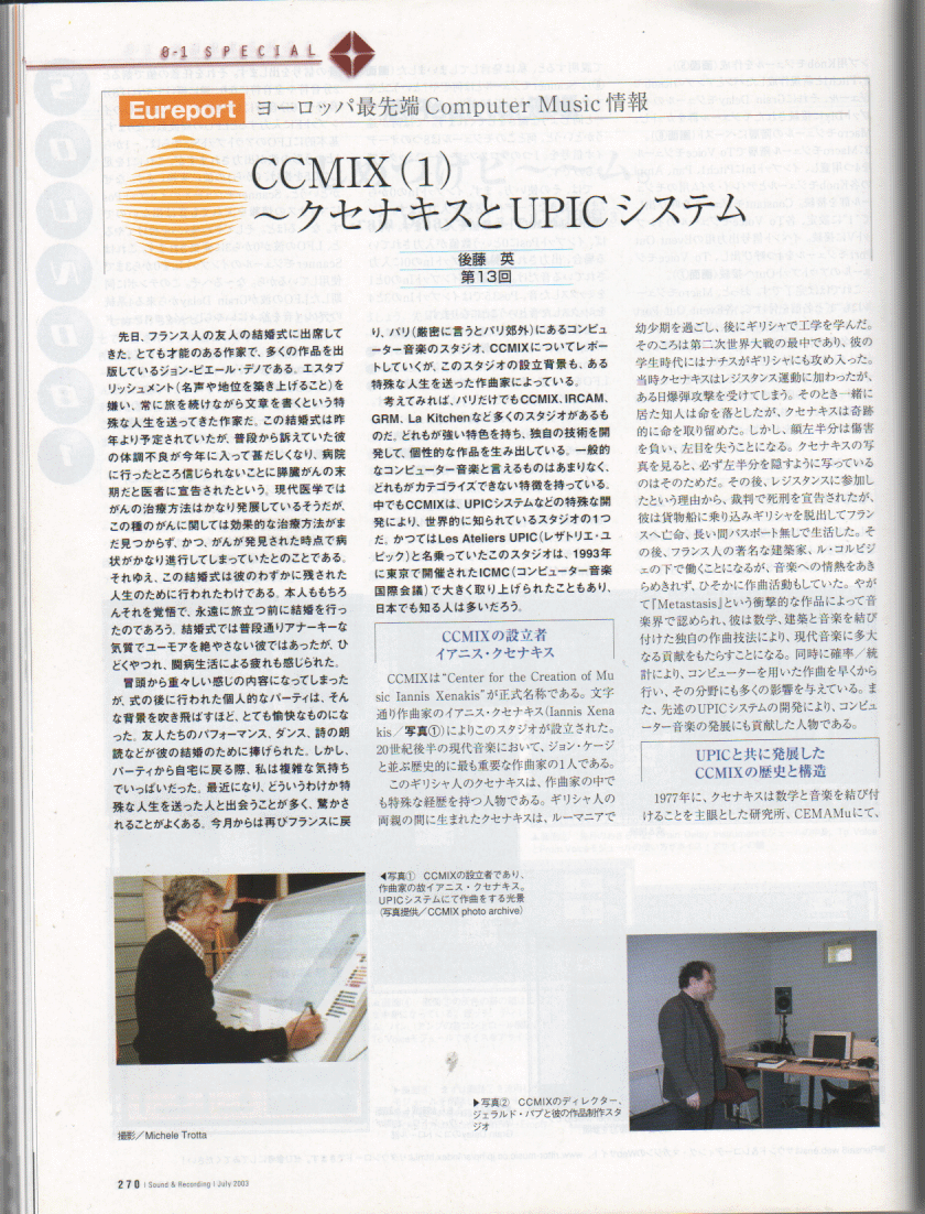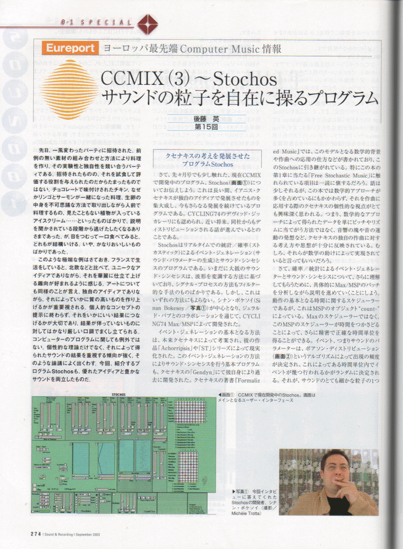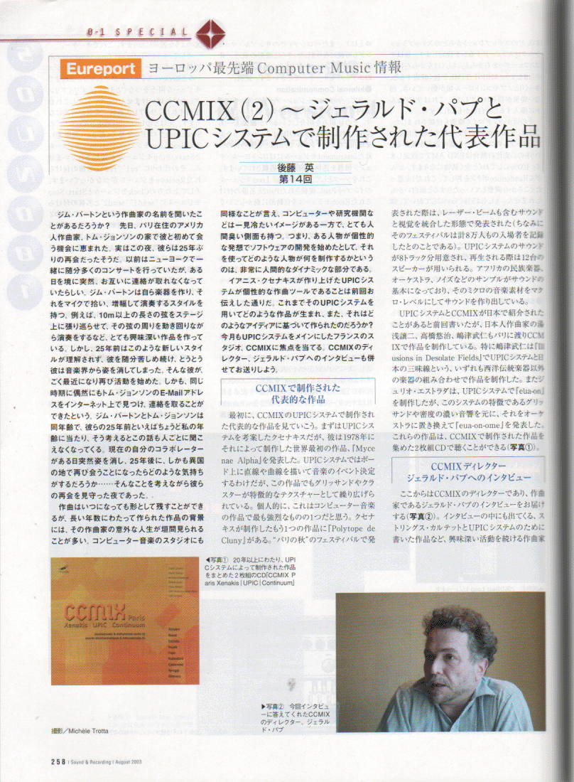 NIME04に合わせて来日予定の、パリのスタジオ CCMIXのディレクタGerard Pape氏から、 作曲家の後藤英さん(IRCAM)をメンバーに含む以下のような企画を提案いただいています。 内容、条件などは柔軟に相談に応じるそうです。 後藤英さんには、NIME04の翌日、6/6にSUACでのMAF2004公開レクチャーコンサートに 出演いただく予定ですので、それ以外、「6/2以前」「6/7以降」の日程で、 このような企画を呼んでみたい、というような、大学・機関・ホール・ギャラリー・研究所・企業などがありましたら、 紹介いたします。 こちらまでメイルで御連絡下さい。日本語での関連情報(記事) その1 その2 その3 その4 その5 その6