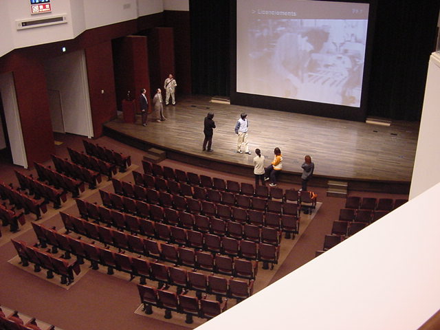 It is ready to offer small and cheap sub mixers. However, there is no fully satisfying guarantee.- It is equipped fully with the screen and video projector on a stage. What can be projected is NTSC-video (RCA or S-video) and a computer (VGA-SVGA-XGA). It is equipped fully with the buffer which extends a signal from the computer near a stage.