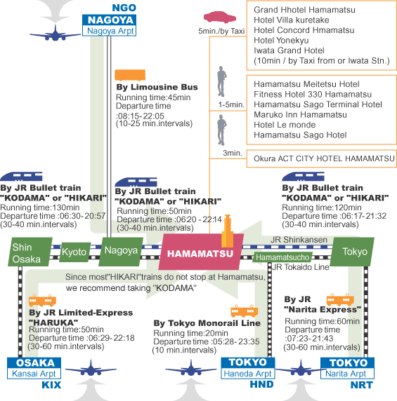 Dear *****,Hello !>I am having trouble, however, getting information about trains in >Japan. Both to/from Narita -> Tokyo and to/from Tokyo -> Hamamatsu. Do >you know how much a train to/from both locations costs? Also, how long >it takes for both? If you know of a good web page to get that >information, that would also be very helpful.There are some useful Webpages for travelling in Japan(train, flight, hotel,etc) but all of them are in Japanese.Everyday I search/reserve with the webpages.I do not know English Webpage for Japanese Travelinformation now, so if I will find the page, I willinform you.NARITA --> HAMAMATSUThere are about 3-4 kinds of travel ways, but I thinkonly 1 way is convenient for oversea people. Other waysare so difficult because you must change trains in somecrowded stations without English displays.At Narita Airport, please go to "JR ticket" counter, and you should use JR line.(Narita Airport has 2 different train line, JR andKeisei Line. Do not choose Keisei (SkyLiner))You can buy there: - direct train ticket from Narita Airport to Hamamatsu - express ticket for "Narita Express" to Tokyo - express ticket for "Shinkansen" ("Kodama" or "Hikari") from Tokyo to Hamamatsu(1) Narita Airport --> Tokyo"NARITA EXPRESS" line, about 60mininterval - 2 trains / every hour(Please be careful that Narita Express goes many stations,Shinjuku, Yokohama, etc. Please get off at Tokyo Station)(2) Change trains at Tokyo StationYou will arrive at Tokyo Station at Sobu-Line platform,B4F of Tokyo station, FAR from Shinkansen platform.I know the route very well, but it takes about 12-15minfor me. Then, I think you will take about 30min !With the display "Shinkansen platform", you willgo up to ground-level (escalator or elevatoer), thenyou will watch there are about 20 platforms.The Tokaido Shinkansen is "dark blue" marked, pleasedo not choose "Tohoku/Joetsu Shinkansen" withgreen display.Tokaido Shinkansen platform is NO. 15-19, farestfrom Sobu-Line platform.(3) Tokyo --> Hamamatsu"Tokaido Shinkansen" expressThere are 3 types of JR "Tokaido Shinkansen" express,"Nozomi" - all skips Hamamatsu, so you must not choose"Hikari" - very few stops Hamamatsu (about 90min)"Kodama" - all stops Hamamatsu (about 130min)interval - 2 trains / every hour (Kodama)The ticket will cost 10880yen, and if you choose"non-reserved seat" for Shinkansen, the discountwill about 510yen. In "Kodama", there are many"non-reserved seat" cars, but in the evening thereare so crowded, then I suggest to choose reservationseat.There are many English Displays from Narita Airportto Tokyo Station and Hamamatsu Station, and staffscan understand English, I think.I do not know the time of your arrival Japan/Hamamatsu,but this is the most standard way. Normally, I selectthis way.Best, Yoichi Nagashima